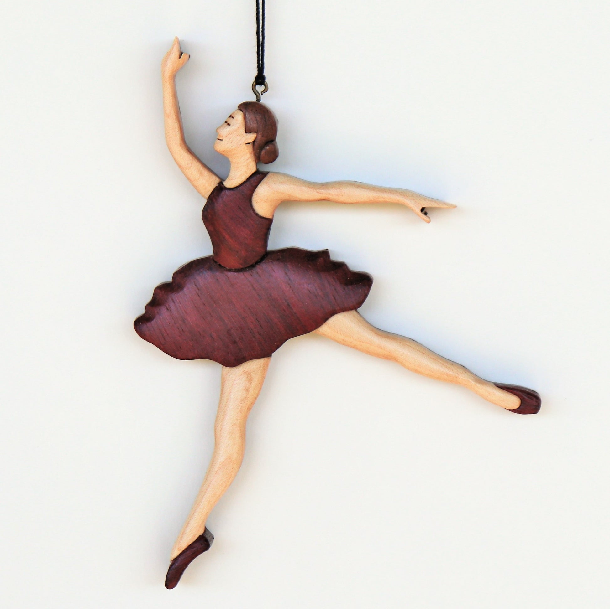 Our Ballerina (ladies dancing) mini intarsia is Day 9 in our 12 days of Christmas collection. Made from 11 segments of maple, purpleheart, & black walnut. Available as a magnet or ornament. Free personalized engravings are available for ornaments. Grain and color will vary some. Dimensions are approximately 5" by 4" and weighs 1-2 oz. You may receive a left or right facing item, but can request a specific direction. This is a one sided item.