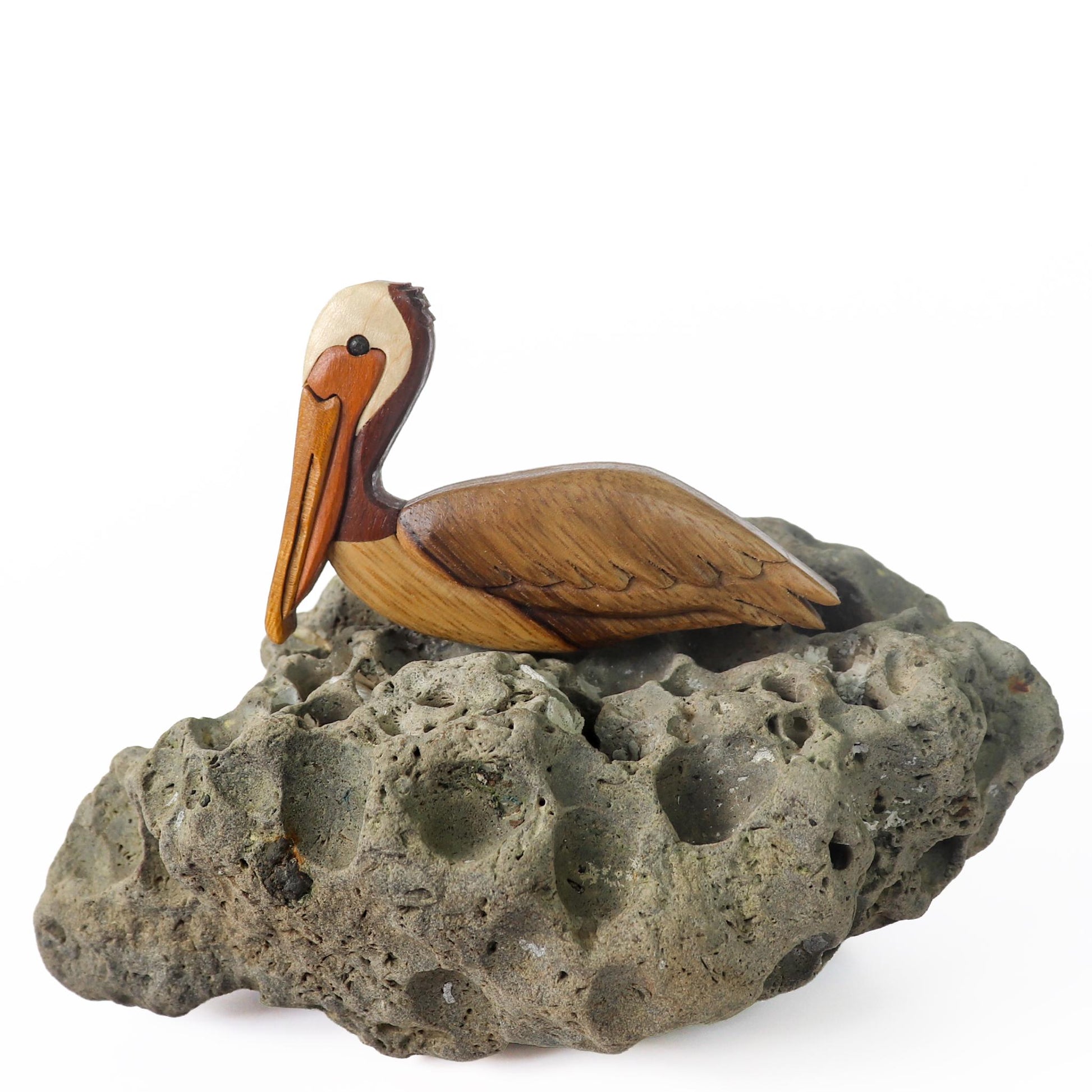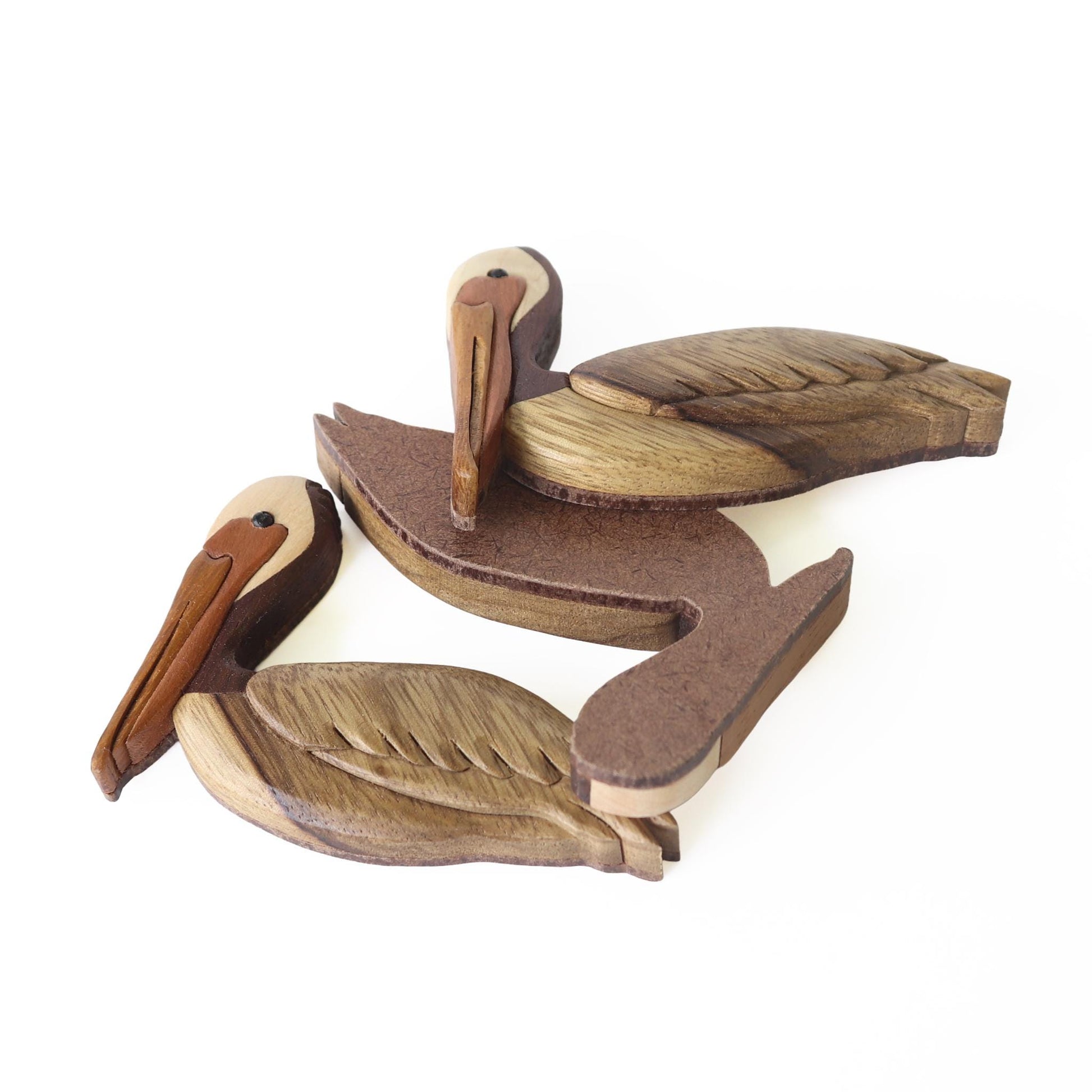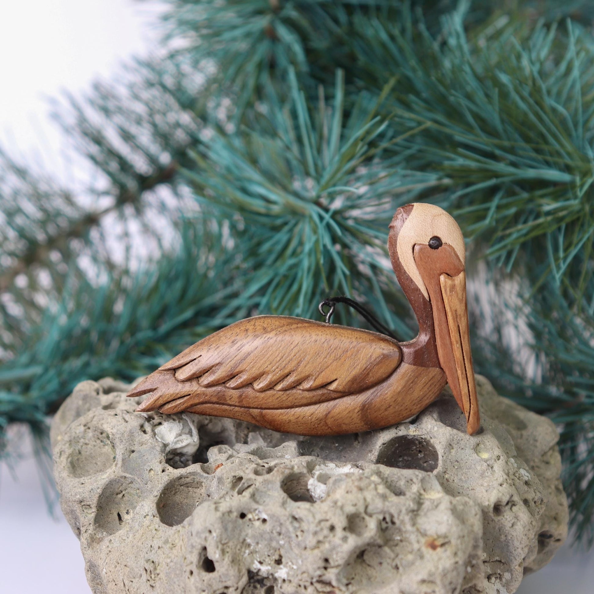 Bring some coastal, relaxing vibes into your home with our handcrafted wooden Brown Pelican. Made in the intarsia artform of segmented wood, this quirky coastal bird decoration is hand-cut on a scroll saw and hand-carved using a variety of techniques. Choose between magnet and ornament options. Perfect for coastal or nautical themes!
