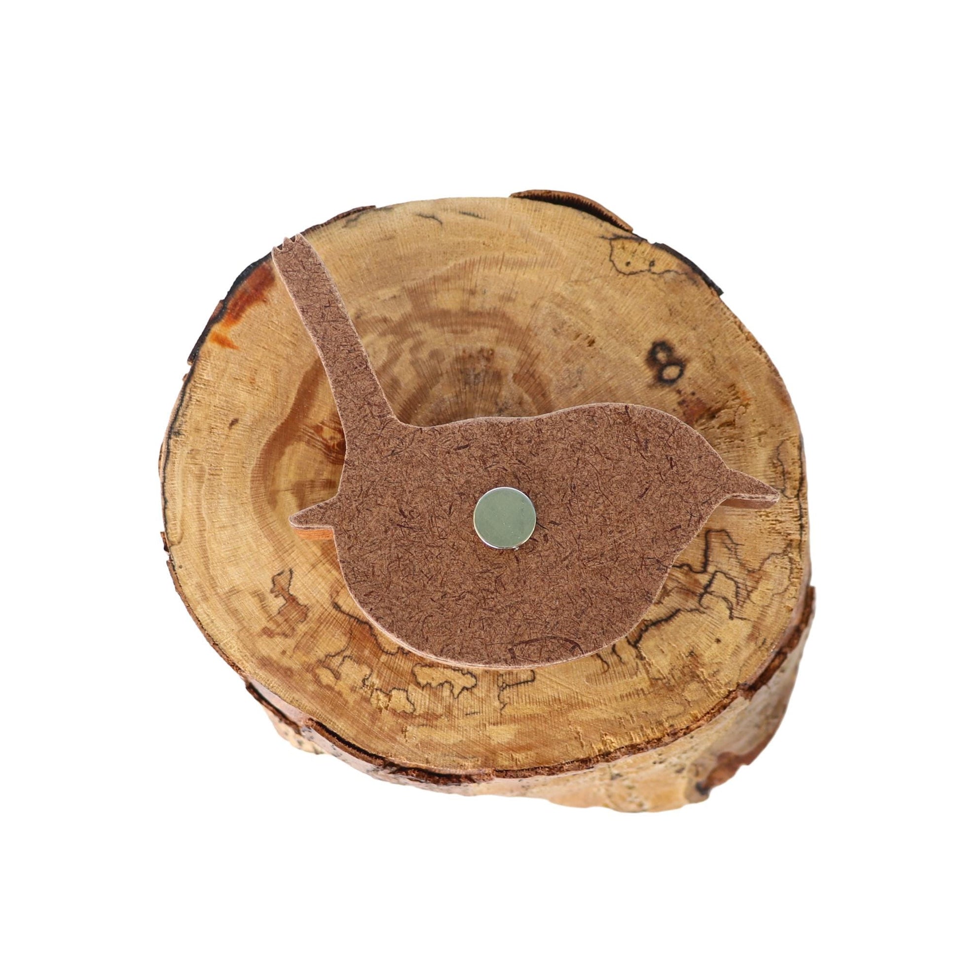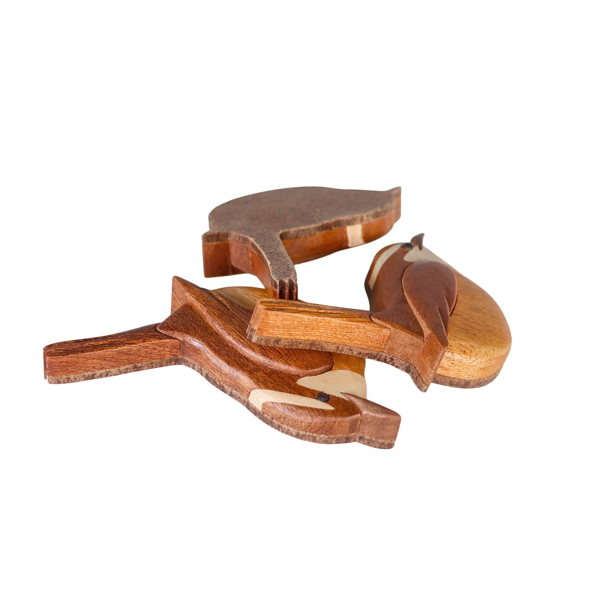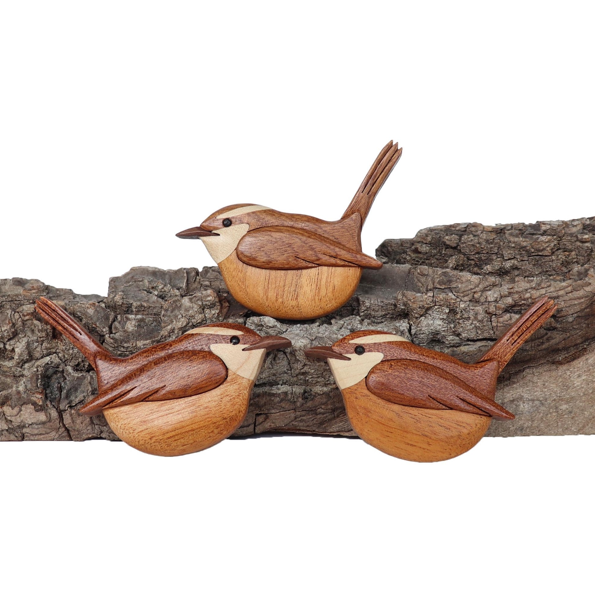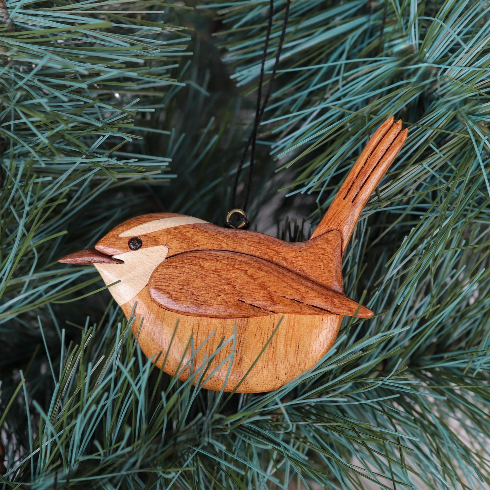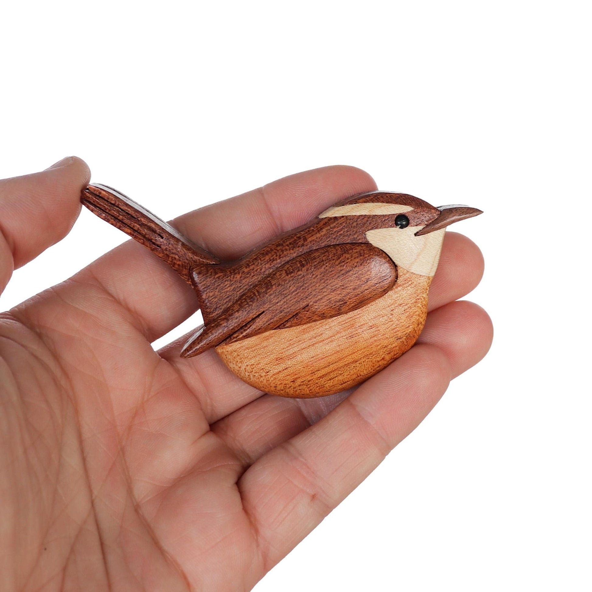 This Carolina wren ornament/magnet exemplifies authentic intarsia woodworking—a technique where precisely cut wood pieces are fitted together to create dimensional art. Each segment is hand-carved to capture the wren's distinctive characteristics, utilizing only the natural color variations of different wood species. This is just one example in our ever growing avian collection and a perfect way to begin or grow your own private bird sanctuary.
