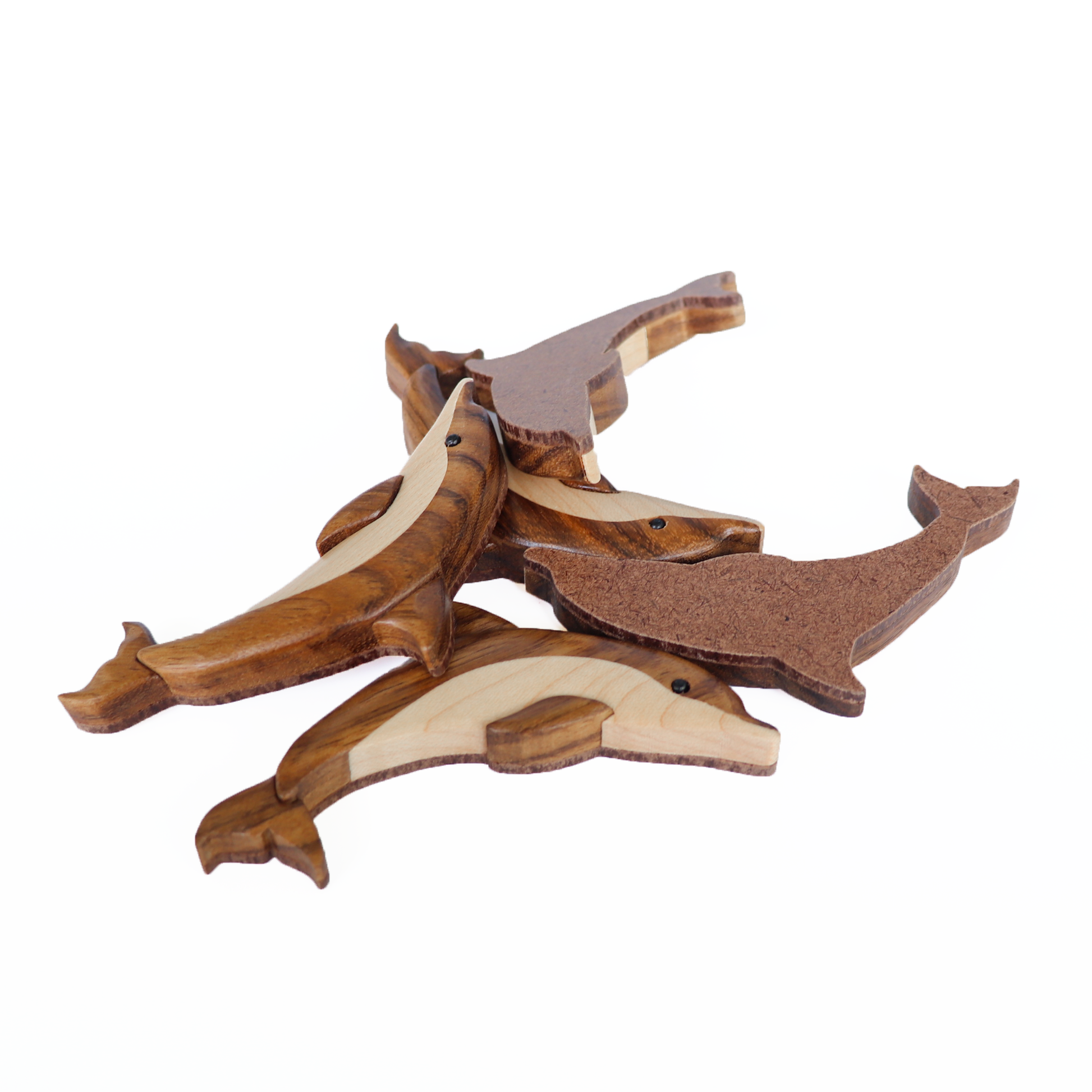 Bring the beauty of the ocean into your home with our hand-crafted Dolphin wood carving. Created from naturally colored wood in the intricate intarsia artform. Choose between magnet and ornament versions to enjoy it year round. Perfect for nature and animal lovers!
