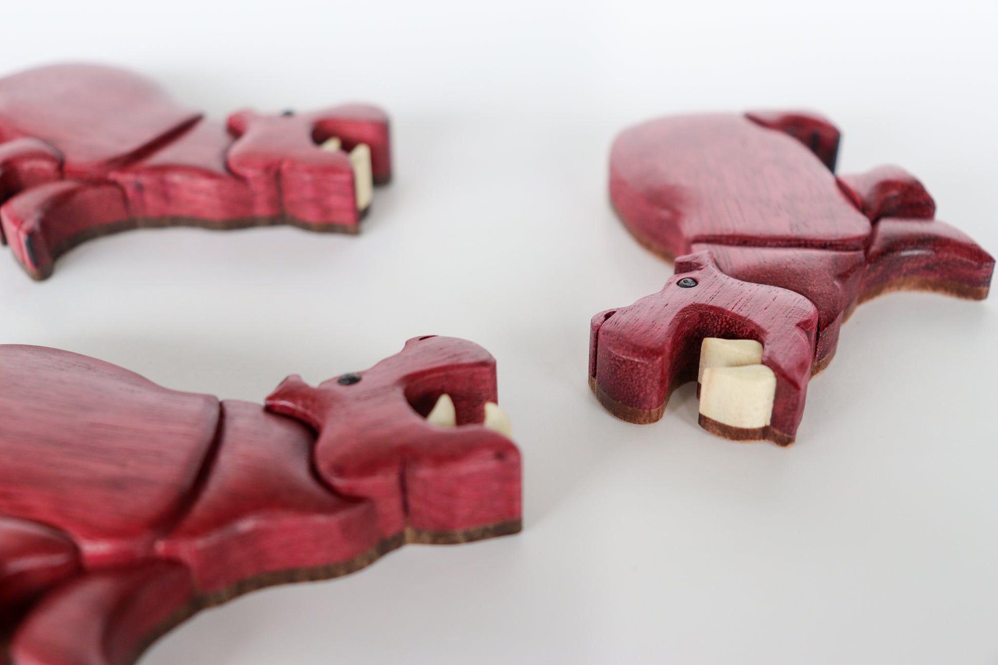 Our Hippo mini intarsia is made from 10 segments of purpleheart & holly. Available as a magnet or ornament. Free personalized engravings are available for ornaments. Grain and color will vary some. Dimensions are approximately 3.5" by 2.5" and weighs 1-2 oz. You may receive a left or right facing item, but can request a specific direction. This is a one sided item.