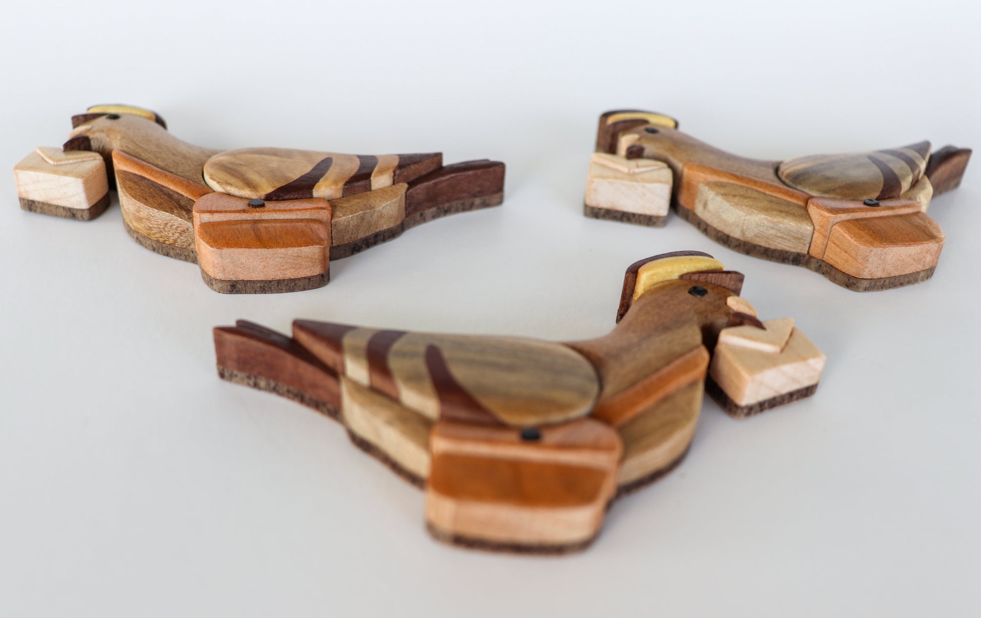 Our Pigeon Mail Carrier mini intarsia is made from 21 segments of yellowheart, cherry, cypress, maple, & walnut. Available as a magnet or ornament. Free personalized engravings are available for ornaments. Grain and color will vary some. Dimensions are approximately 4" by 2.5" and weighs 1-2 oz. You may receive a left or right facing item, but can request a specific direction. This is a one sided item.