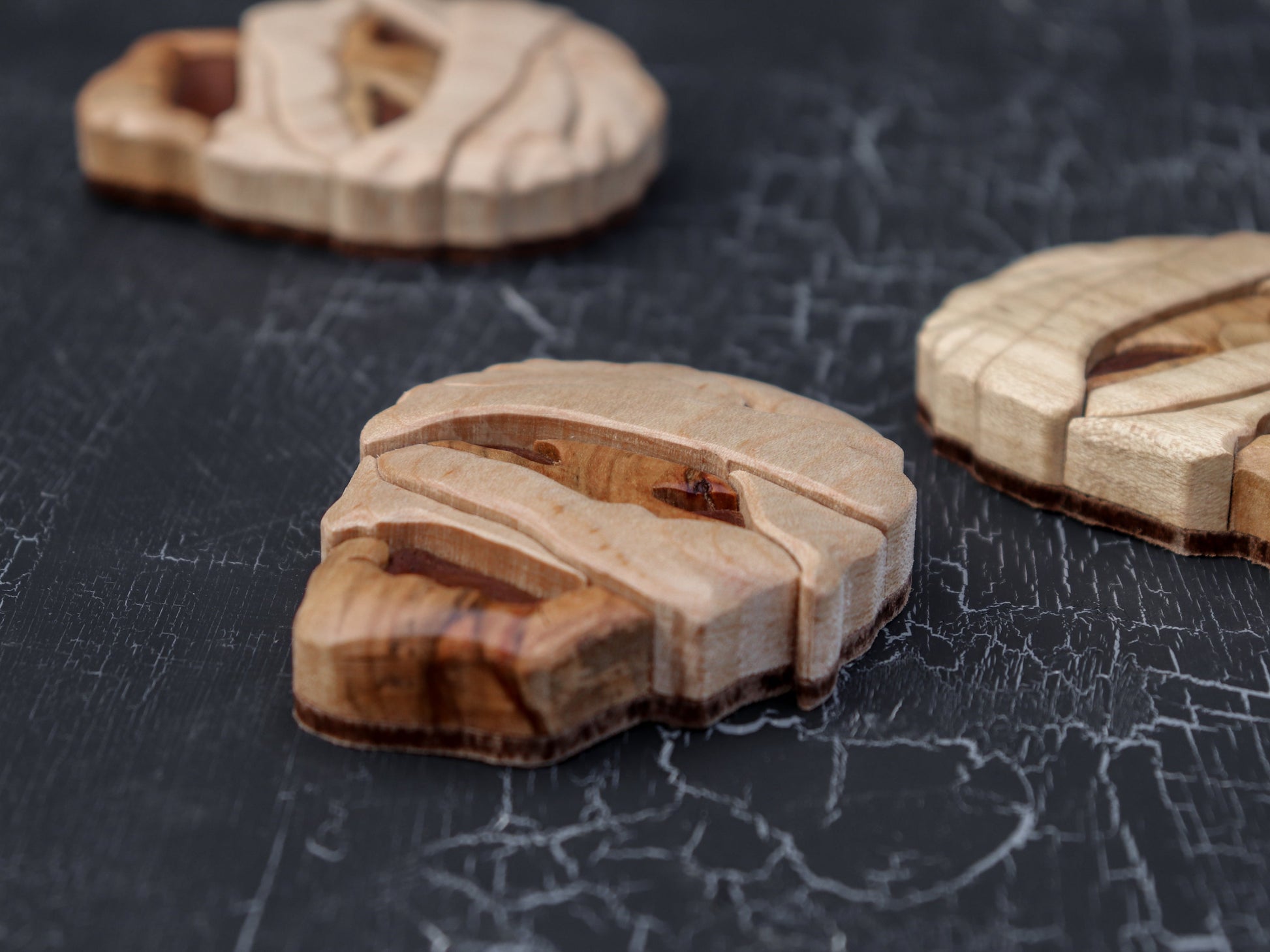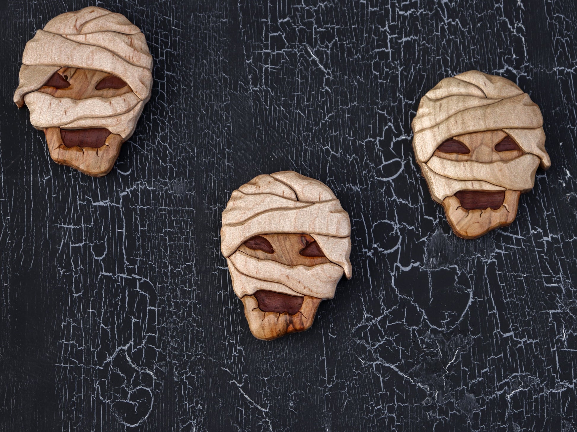 Introducing our chilling intarsia wood carved magnet / ornament, featuring a Spooky Egyptian mummy. 🎃 These unique monstrous creations are meticulously handcrafted from all natural wood, showcasing the intricate art of intarsia woodworking. Each segment is carefully selected and skillfully cut, carved, and assembled to create the perfect Haloween themed decoration