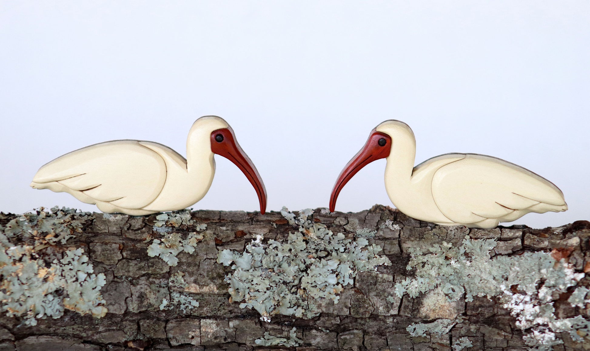 Our White Ibis mini intarsia is made from 5 segments of holly & redheart. Available as a magnet or ornament. Free personalized engravings are available for ornaments. Grain and color will vary some. Dimensions are approximately 3.5" by 2" and weighs 1-2 oz. You may receive a left or right facing item, but can request a specific direction. This is a one sided item.